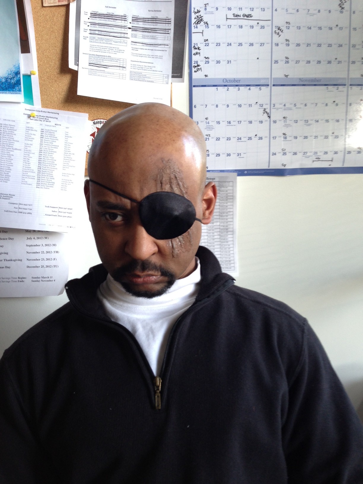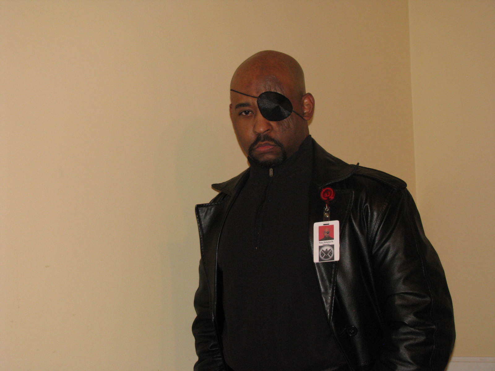 Last night, I was asked to attend an Iron Man 3 premiere… as Nick Fury. Having dressed as Nick Fury before and having all of the parts of the costume already – except for being unable to find my eyepatch, of course – it was an easy thing to agree to do. This time, I asked my friend Melody if she’d mind helping me make one modification to my costume: Scars. With a little latex, some eye shadow, some foundation, and a few pieces of tissue, she went to work.