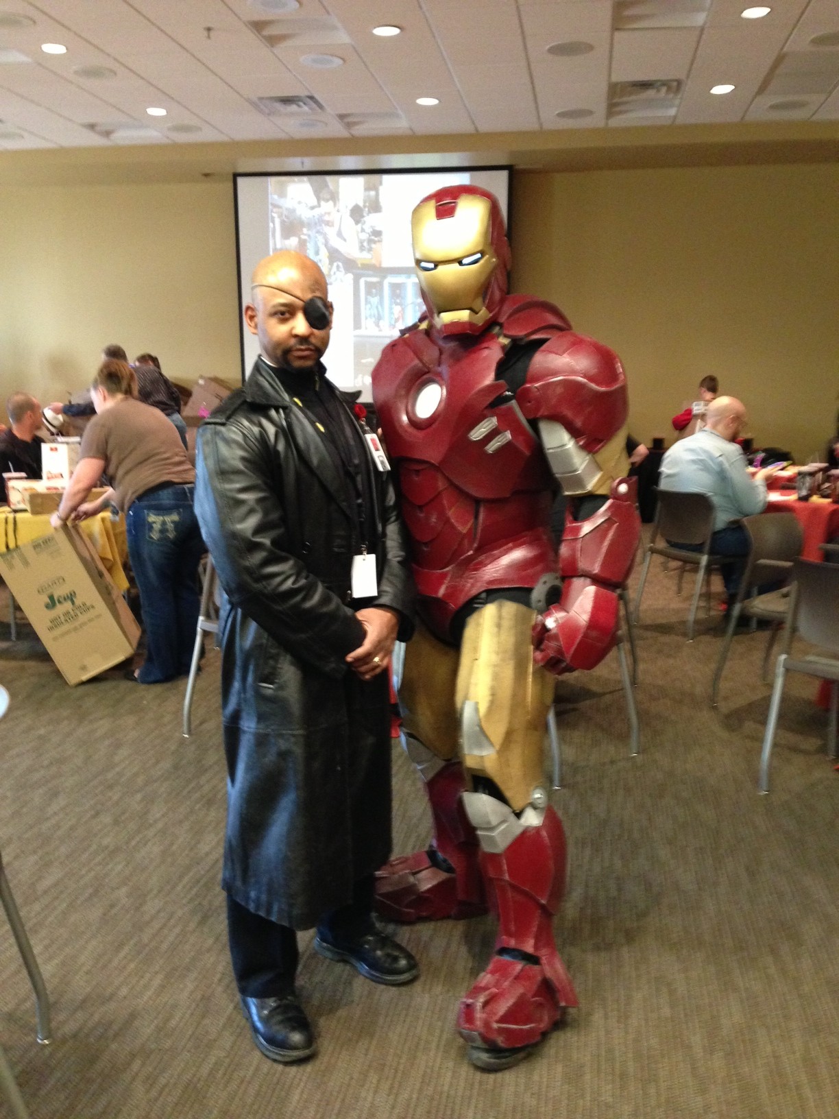 I headed up to the Megaplex Legacy Crossing theatre to for the “Iron Man 3 Red Carpet Party.” The event included a “Make Your Own Armor” (out of cardboard boxes, glow sticks and other ephemera) workshop, trivia games, an obstacle course event, and photos with those of us in costume. I was a bit surprised that there weren’t as many young kids as I had expected, but that didn’t keep the older kids – and some of the older not-kids – from having a good time:
