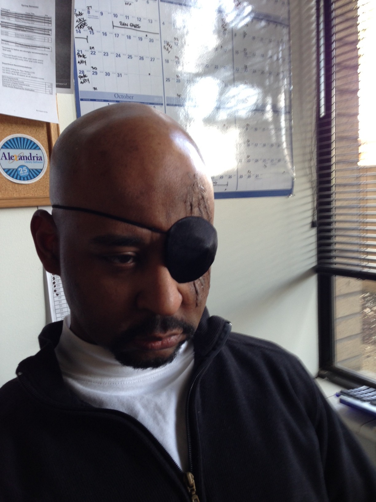 Last night, I was asked to attend an Iron Man 3 premiere… as Nick Fury. Having dressed as Nick Fury before and having all of the parts of the costume already – except for being unable to find my eyepatch, of course – it was an easy thing to agree to do. This time, I asked my friend Melody if she’d mind helping me make one modification to my costume: Scars. With a little latex, some eye shadow, some foundation, and a few pieces of tissue, she went to work.
