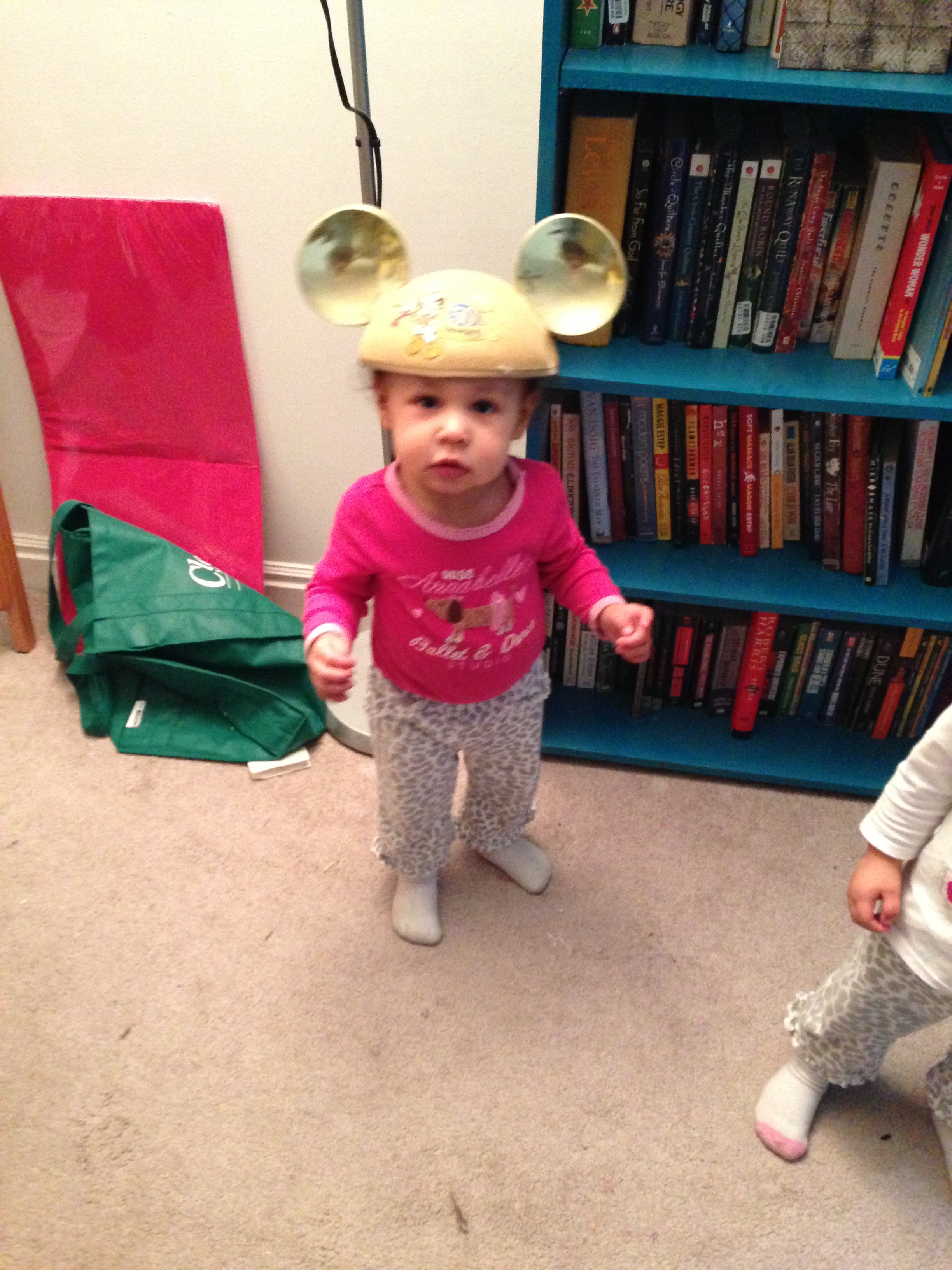 Vanessa, test-driving Daddy’s 50th Anniversary Disneyland Mickey Mouse Ears…